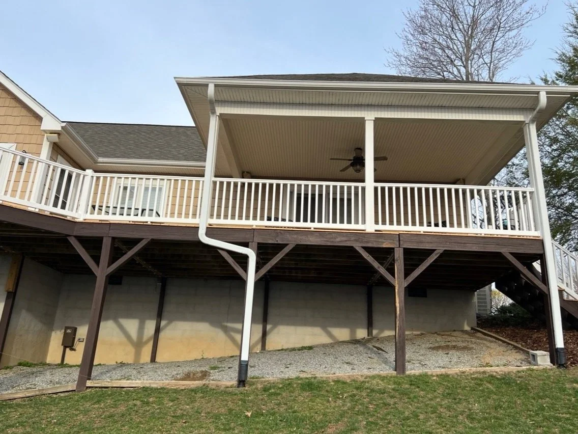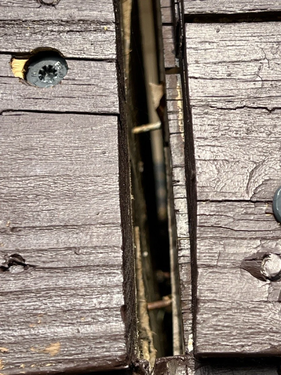 Support bands on this deck had separated considerably over time. We first installed lag screws to stabilize the structure and added a third band to overlap the joint.