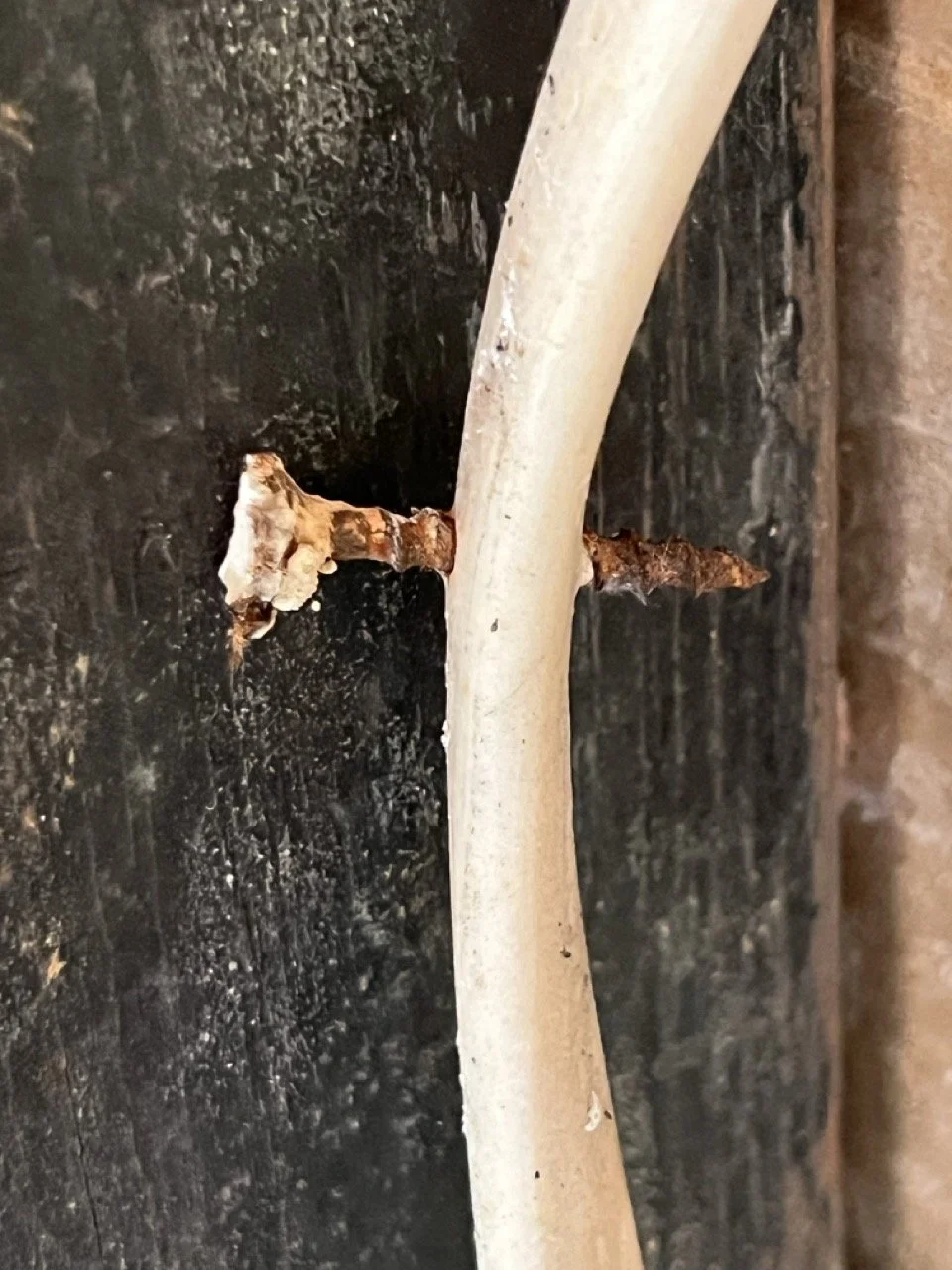 During demolition we found this drywall screw inserted into a live electrical wire. Potential fire hazard.